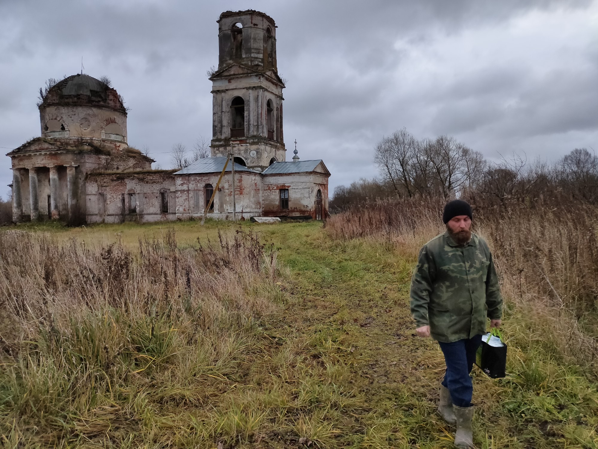 Алексей у храма в честь Успения Пресвятой БогородицыФото: Светлана Ломакина Жизнь в заброшенный храм возвращалась медленно. Местные собрали деньги на минимальный ремонт притвора, а Пронин обошел друзей, вчерашних школьников — они и взялись за мастерки и лопаты. Когда более-менее навели порядок, Алексей сам написал иконы: потому что их в селе не осталось — все скупили и вывезли в девяностые годы. На эту работу Пронин получил благословение у местного батюшки: «Очень хороший был, поощрял всю эту мою “самодеятельность”, а я и рад, потому что в нашей семье рисовали все до самых дальних корней».
