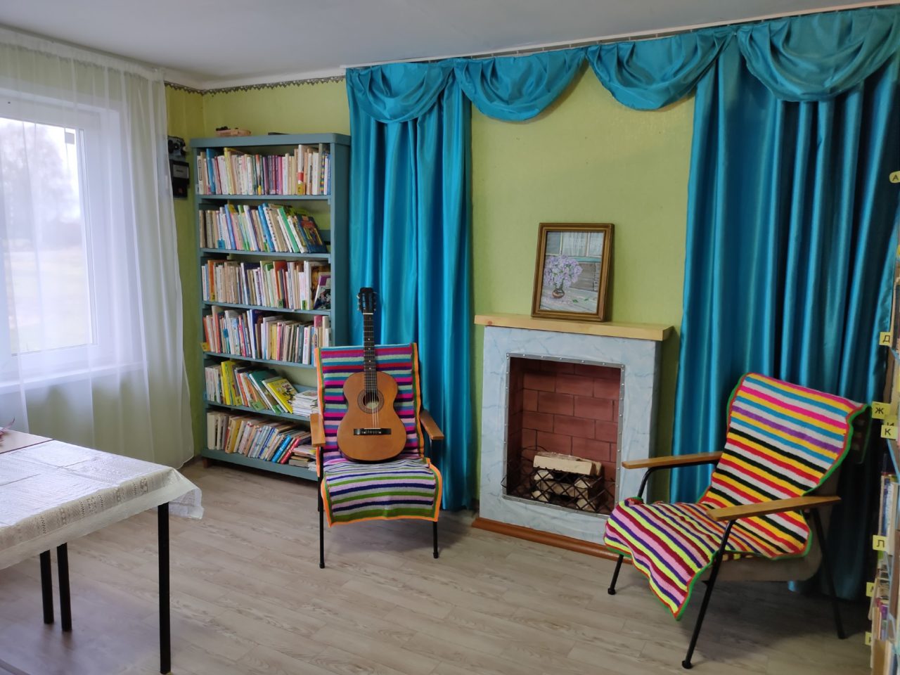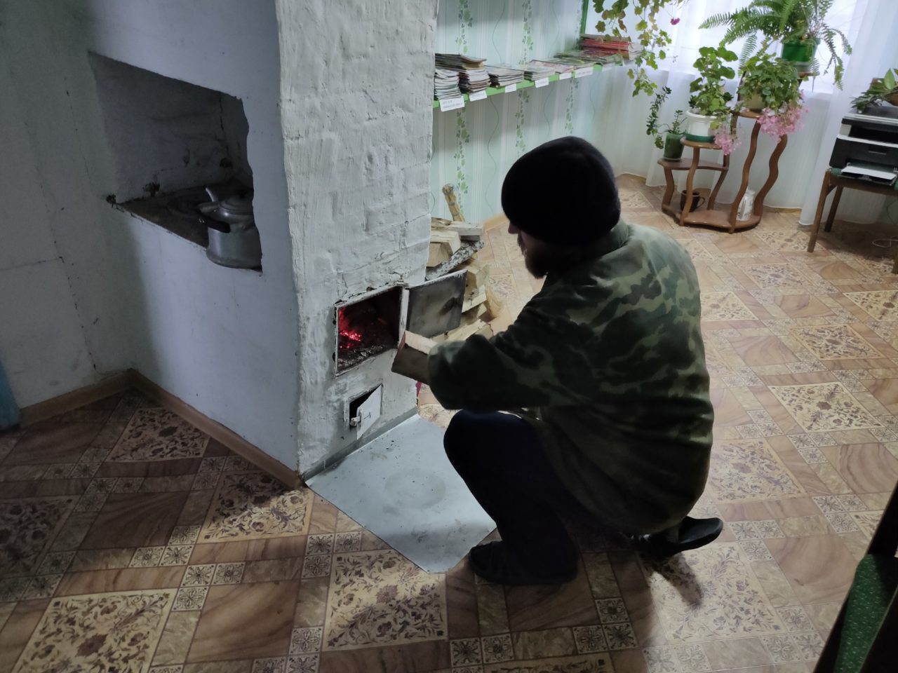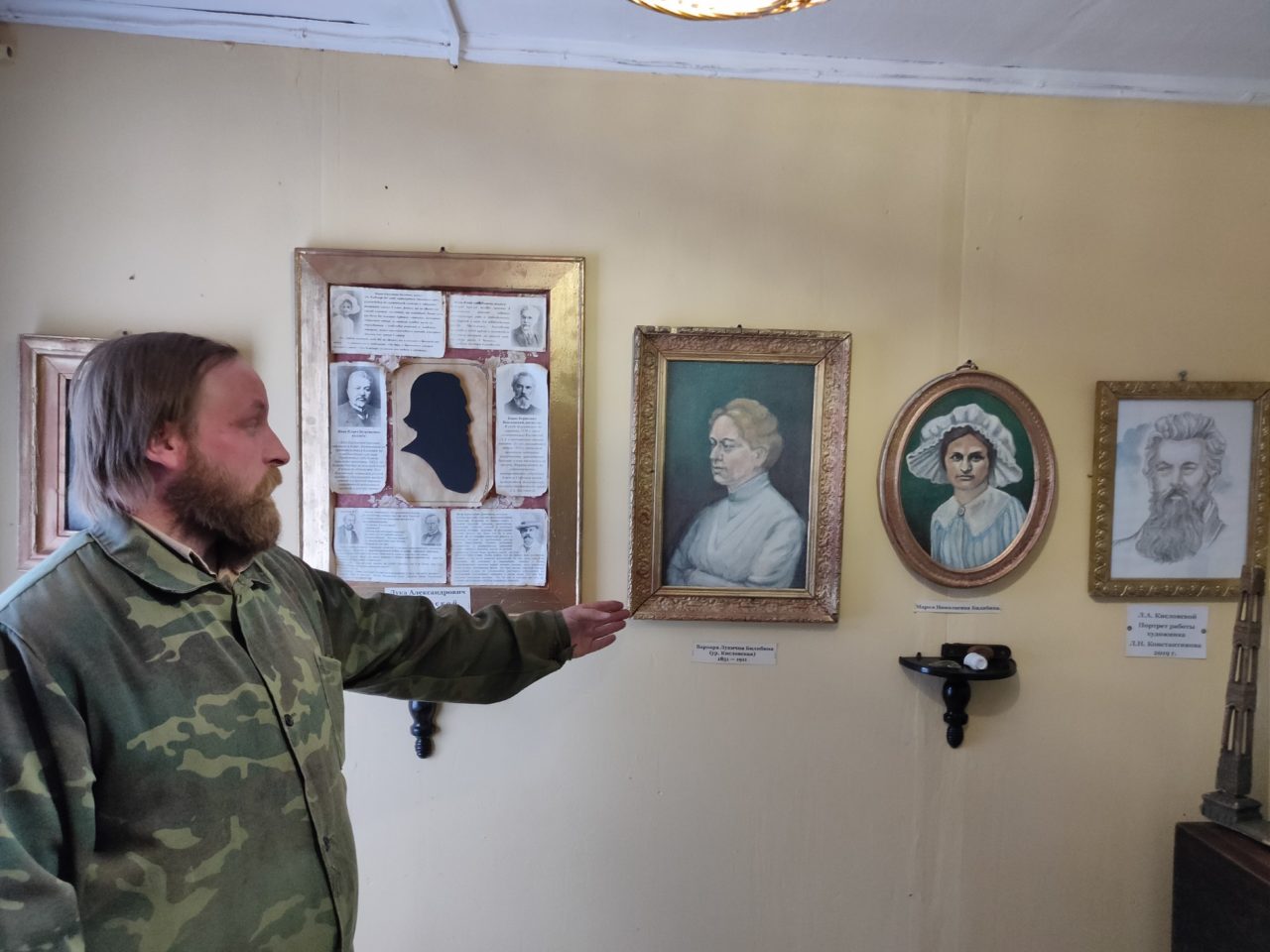 У входа в библиотеку Алексей по-хозяйски переобувается из сапог в шлепки, мне же выдает тряпку, чтобы вытерла ноги. В доме висит легкий запах хлорки и теплый печной дух. Пока я рассматриваю портреты писателей, выполненные юными художниками, библиотекарь подбрасывает дрова — и в печном животе начинается тихое бормотание.