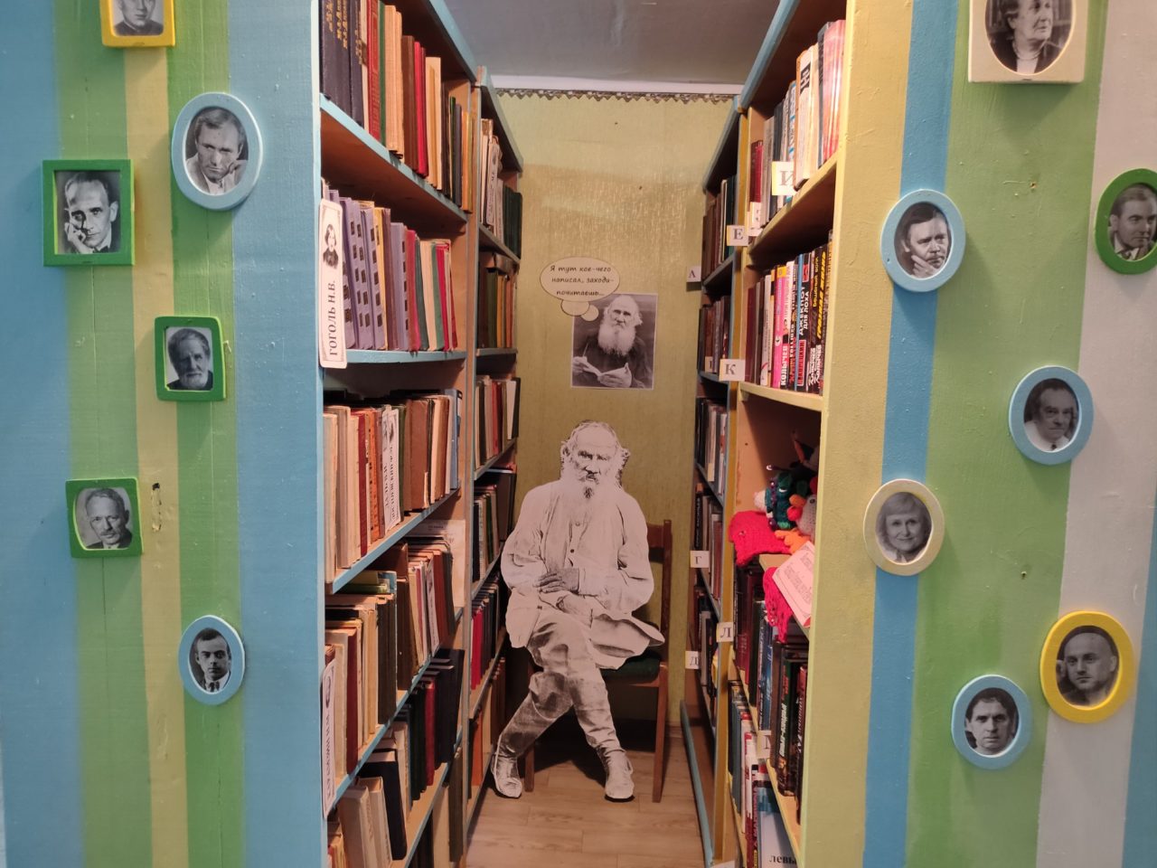 В библиотекеФото: Светлана Ломакина Я делаю два шага вперед и: «О боже! Алексей! Я чуть не поседела!» Между полок с книгами во весь свой человеческий рост сидит Лев Толстой. Картонный, конечно, но, как говорится, с мороза не разберешь. Классик собран из листов, распечатанных на обычном офисном принтере. А над головой его висит укоризненное: «Я тут кое-чего написал, заходи — почитаешь…»