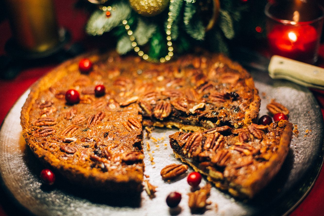 Пекан нужно прокалить на сковородке или в духовке на пекарской бумаге. Отберите горсть самых «фотогеничных» и целых орехов для украшения, остальное измельчите. Клюкву промойте и залейте кипятком. Еще можно ее заранее замочить вместе с коньяком, ромом, виски или бурбоном.