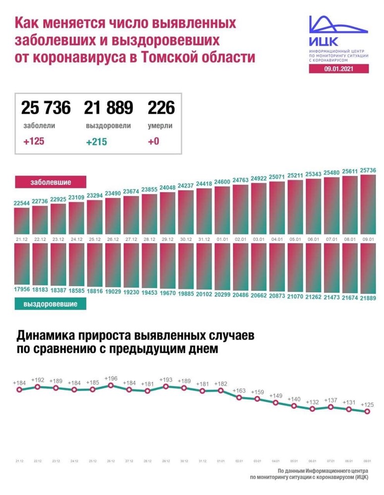 Томская область по итогам суток поднялась на одну позицию в общем списке регионов России по количеству выявленных случаев коронавируса. Она находится на 60 месте. Сегодня поставлено 125 положительных диагнозов COVID-19, на шесть меньше, чем днем ранее. 215 человек выписаны из стационаров. Летальных исходов сегодня зафиксировано не было.