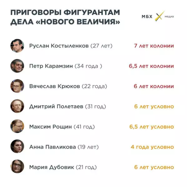 В итоге, как и ожидалось, условные сроки получили те, кто практически не участвовал в «Новом величии», и две девушки: Мария Дубовик и Анна Павликова. Обе получали гораздо больше поддержки, чем все остальные фигуранты вместе взятые. И они остались на свободе, хотя делали для сообщества не меньше, чем тот же Костыленков, который получил самое суровое наказание. Возможно, если бы общество заступилось не только за девушек, то с условными сроками вышли бы все.