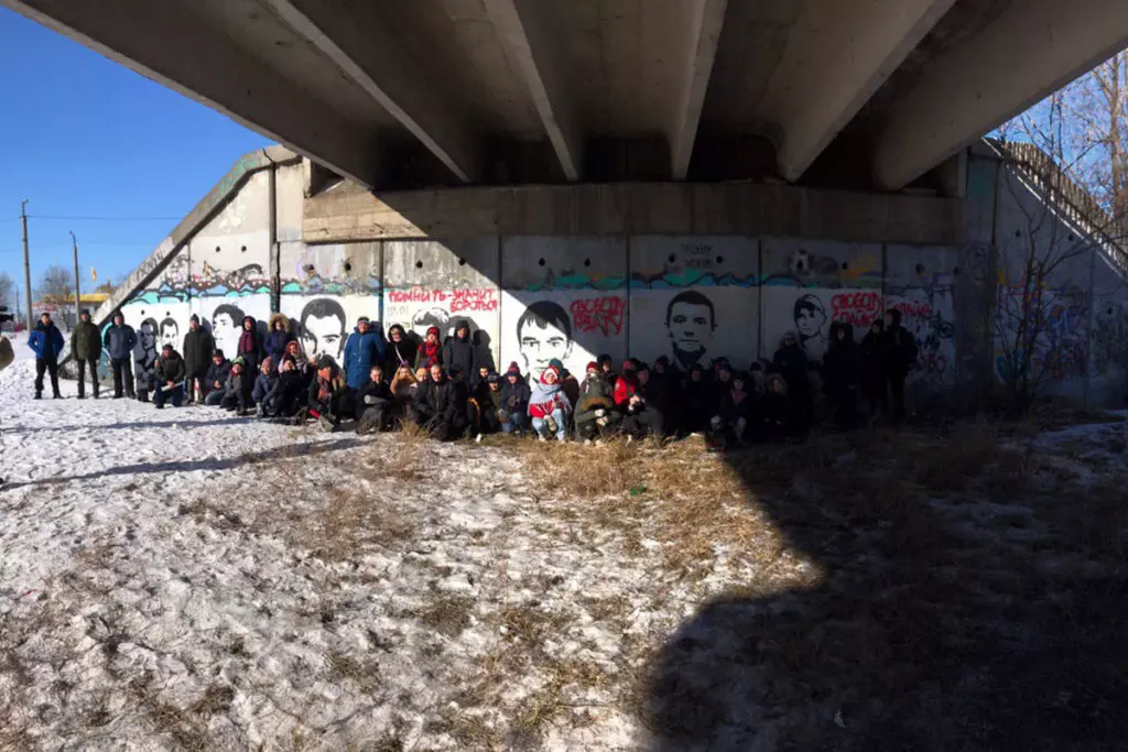 Активисты и родственники фигурантов дела «Сети» на фоне граффити с портретами ребят из «Сети» и Азата Мифтахова. Фото: Анастасия Ольшанская / МБХ медиа
