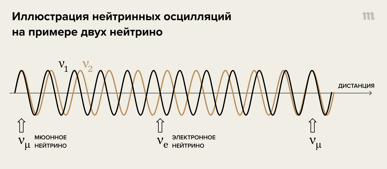 Когда нейтрино рождаются в распадах ядер или частиц, они несут с собой «свидетельство о рождении» — отметку, что за сорт частиц участвовал в процессе их рождения: электрон или его более тяжелые собратья, мюон и тау-лептон. Если нейтрино родилось в паре с электроном, то это электронное нейтрино, если в паре с мюоном — мюонное и так далее. Но прямо в процессе своего движения, хоть внутри вещества, хоть в вакууме, эта идентичность постепенно меняется. Нейтрино, рожденное как электронное, на некотором расстоянии от точки рождения будет частично электронным, частично мюонным, частично — тау. Пролетев еще немного, снова соберется в преимущественно электронное. И такая «смена нейтринных лиц» будет продолжаться довольно долго. Это и есть нейтринные осцилляции, потому что описанная закономерность появления разных «лиц» нейтрино — почти периодическая. Но рано или поздно осцилляции прекратятся. Что же увидят экспериментаторы когда это произойдет — электронное, мюонное или тау нейтрино? Ни одно из них! Вместо этого они обнаружат с некоторой, не зависящей ни от энергии, ни от расстояния вероятностью, нейтрино с определенной массой.