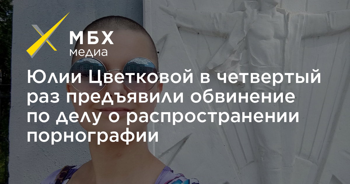 Следствие в четвертый раз предъявило обвинение художнице Юлии Цветковой по делу о распространении порнографии (пункт «б» части 3 статьи 242 УК) из-за паблика «Монологи вагины», где опубликованы рисунки на тему бодипозитива. Об этом «МБХ медиа» сообщила мать художницы Анна Ходырева.