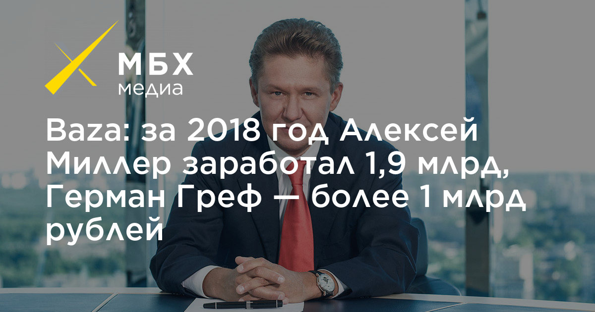 Глава «Газпрома» Алексей Миллер за 2018 год заработал 1,9 млрд рублей, а глава «Сбербанка» Герман Греф — более 1 млрд рублей. Издание Baza совместно с телеграм-каналом «Жаба и Гадюка» выяснили официальные доходы некоторых глав госкомпаний. Данные предоставил источник издания, имеющий доступ к базам Федеральной налоговой службы.