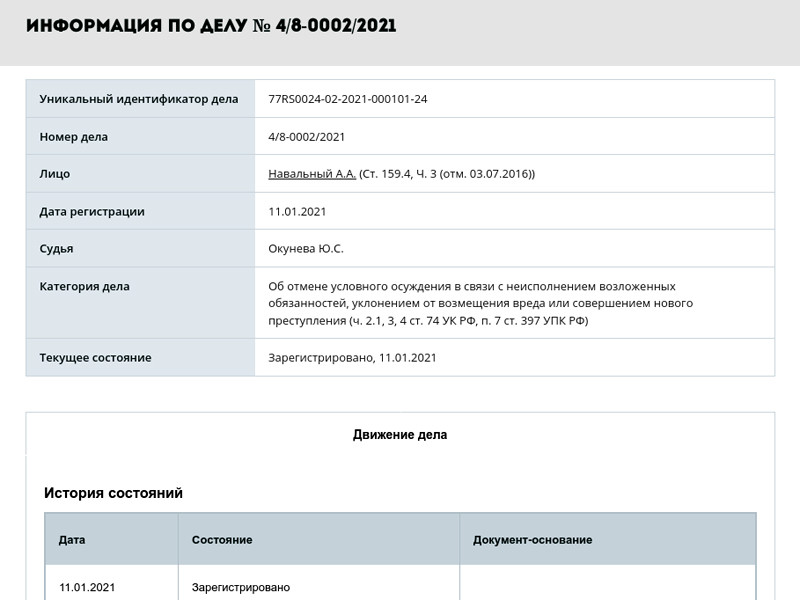 Алексей Навальный в указанное время не явился. Иск, как следует из карточки дела, подан "в связи с неисполнением возложенных обязанностей, уклонением от возмещения вреда или совершением нового преступления", отмечает радио "Свобода".
