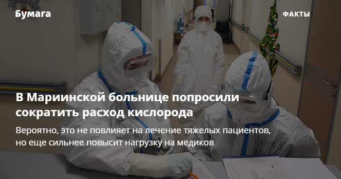 При этом другой источник говорит, что медиков не просили отключать от кислорода пациентов, которым он необходим. Еще один собеседник «Бумаги» — врач, ранее работавший в Мариинской больнице, — также уверен, что тяжелых больных от кислорода никто отключать не будет. Однако, по его словам, сократить подачу могут среднетяжелым пациентам, которые «получают кислород в профилактических целях».