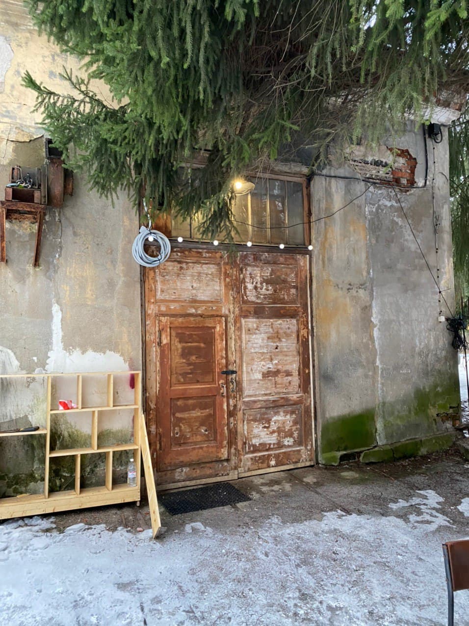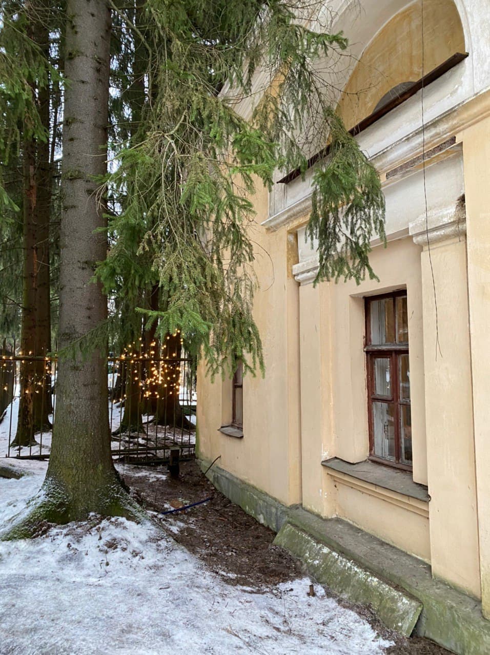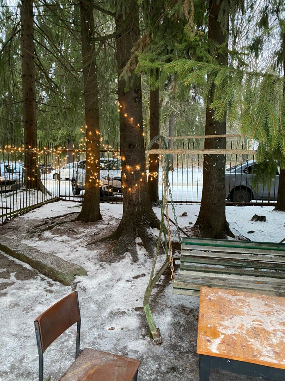 Двор украшен гирляндами, которые смотрятся очень уютно в сочетании с пышными сосновыми ветками. Здесь же — качели и столик, за которым можно выпить кофе.