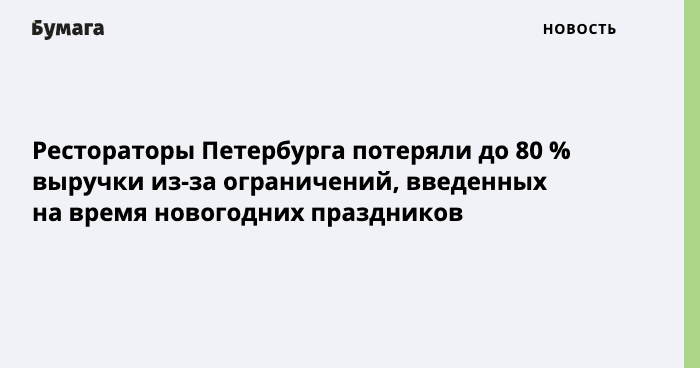 Рестораторы в Петербурге потеряли до 80 % выручки из-за введенных ограничительных мер в новогодние праздники по сравнению с аналогичным периодом 2020 года. Об этом заявил ТАСС президент Федерации рестораторов и отельеров России Игорь Бухаров.