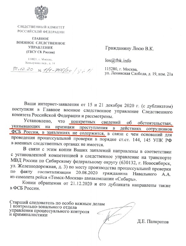 Тем временем Следственный комитет отказался проверять жалобы Фонда борьбы с коррупцией в отношении сотрудников ФСБ, отравивших Навального: в главном военно-следственном управлении СК сочли, что в заявлениях ФБК нет "конкретных сведений об обстоятельствах, указывающих на признаки преступления" в действиях чекистов.