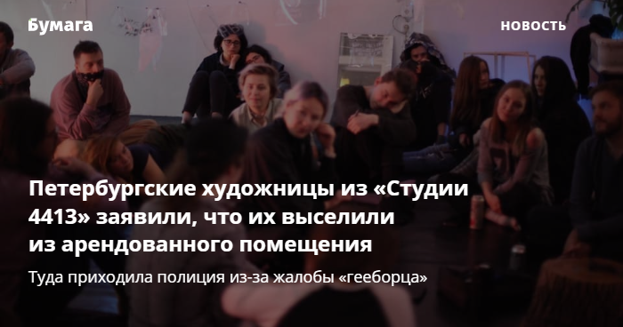 Арт-резиденция «Студия 4413» открылась в Петербурге два года назад. Создательницы называют ее «культурным транзитом». Там проходили философские семинары, собрания, выставки, перформансы, были школы, танцклассы, детские занятия и научно-исследовательские лаборатории. Несмотря на то, что помещение не было жилым, там временно проживали некоторые художники: к моменту выселения — четыре человека. Сейчас художницы ищут новое помещение.