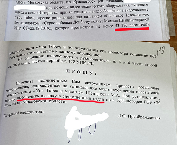 Согласно документу, подписанному старшим следователем Л.О. Преображенской, трансляцию с участием Шендакова посмотрели не менее 43386 зрителей, по ней было оставлено 867 комментариев. Преображенская попросила начальника УМВД по Красногорску Н.Н. Жукова "обеспечить явку" зрителей видео в городской отдел СК.