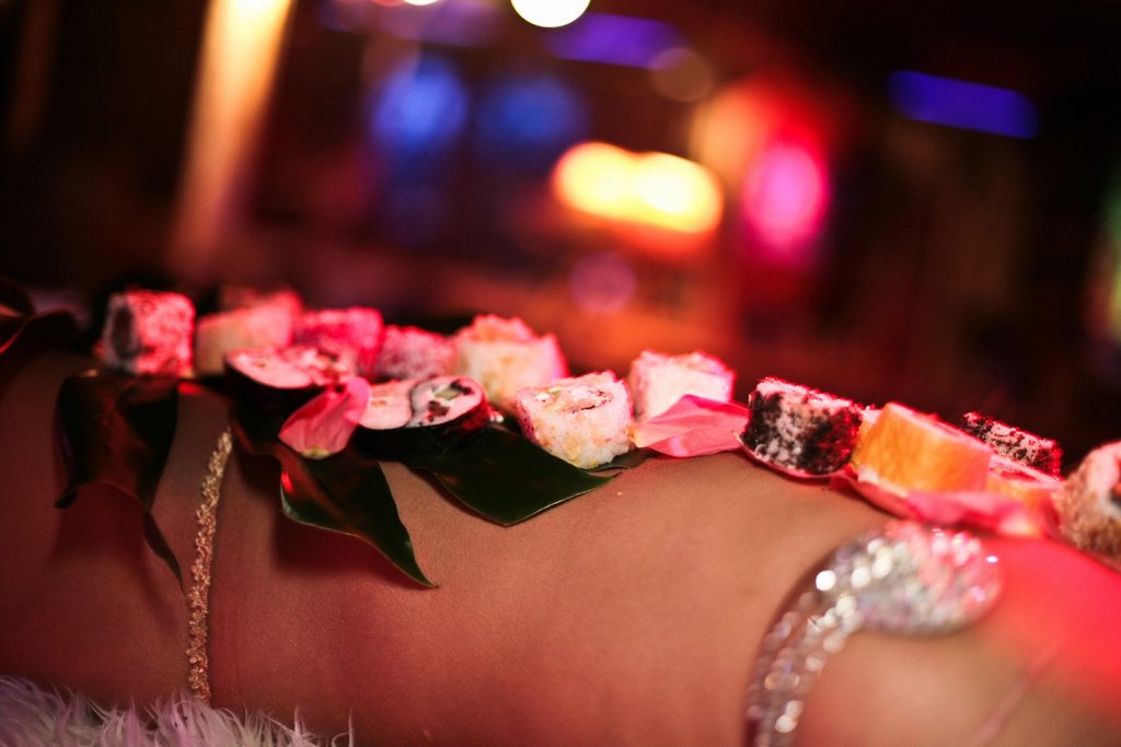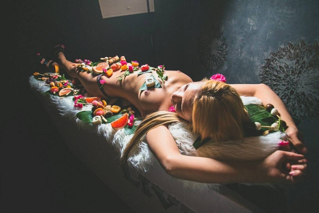 Когда работаешь ниотамори, в процессе подготовки первым делом нужно сходить в туалет, потому что, когда уже разложили суши и роллы, вставать нельзя. Я была в трусах и обуви, топлес. На меня положили большие зеленые листья из тропических стран, не какой-нибудь наш подорожник. На листочки и тело раскладывали роллы и суши, у меня на груди были листочки с роллами. Не было какой-то нормы, сколько килограммов еды должно быть на теле, но главное, чтобы было красиво и не было пустого пространства — периодически докладывали или перекладывали, чтобы все эстетично выглядело.