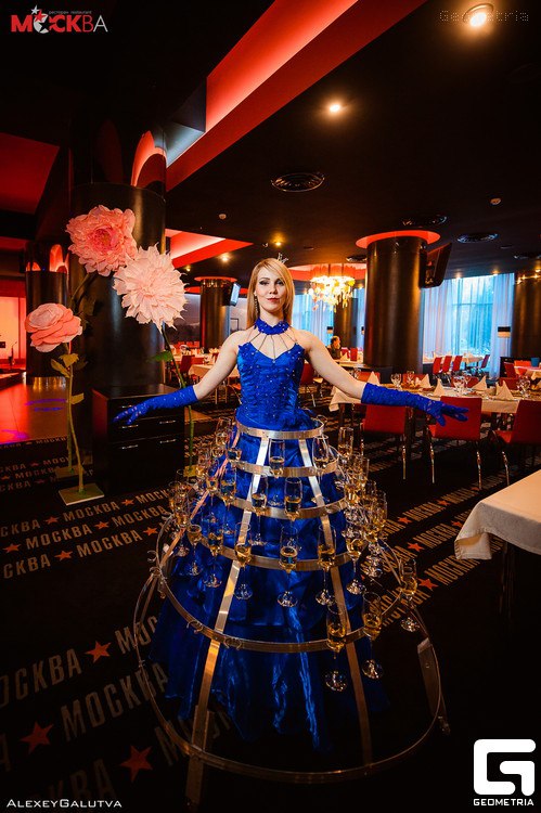 Конструкция за счет колесиков не тяжелая: стол сам по себе, я сама по себе, на мне кофта, которая переходит в скатерть. Все время стоишь на ногах, но обычно леди-фуршет заказывают на час, потому что фуршет происходит в начале мероприятия, а дальше люди уходят на какую-нибудь шоу-программу и не будут все время подходить за шампанским и закусками. У нас самая популярная анимация — воздушная гимнастика, там человек рискует жизнью, не дай бог сорвется и разобьется насмерть, а в анимации леди-фуршет ты просто стоишь или ходишь. Может, из-за того, что на тебе конструкция, которую нужно за собой везти, ты на ранг выше просто аниматора, но все равно это средняя нагрузка.