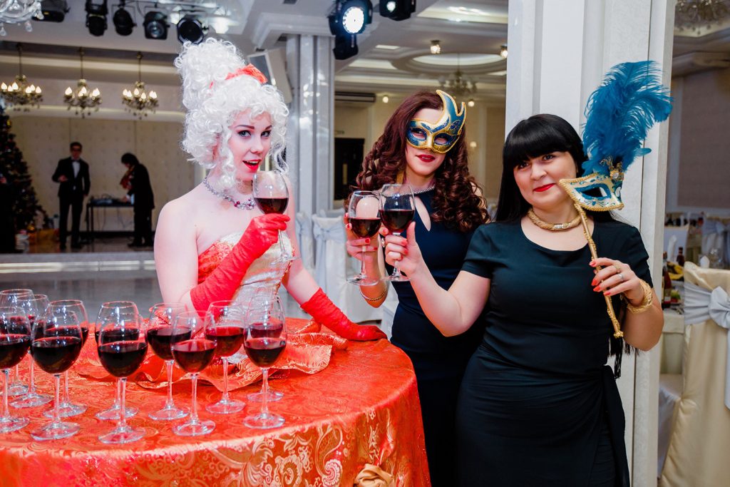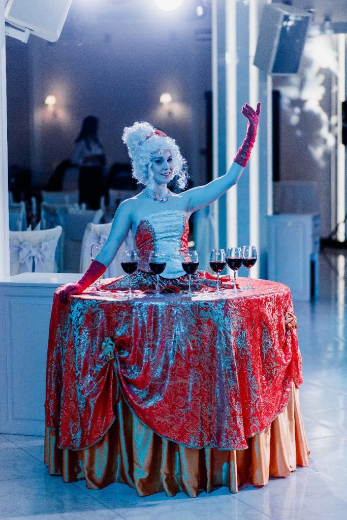 Мы приезжаем на выступление, собираем стол сами, надеваем на него подходящую скатерть, надеваем костюм, красимся и идем работать. У нас два стола: в один нужно пролезать под скатертью, другой — стол-торт, он раздвигается посередине. В нем можно работать леди-фуршет, но из него может даже вылетать воздушная гимнастка: девушка прячется в этом торте и вылетает из него, хватаясь за реквизит, который спускают сверху, и работает в воздухе. У нас был один такой заказ.