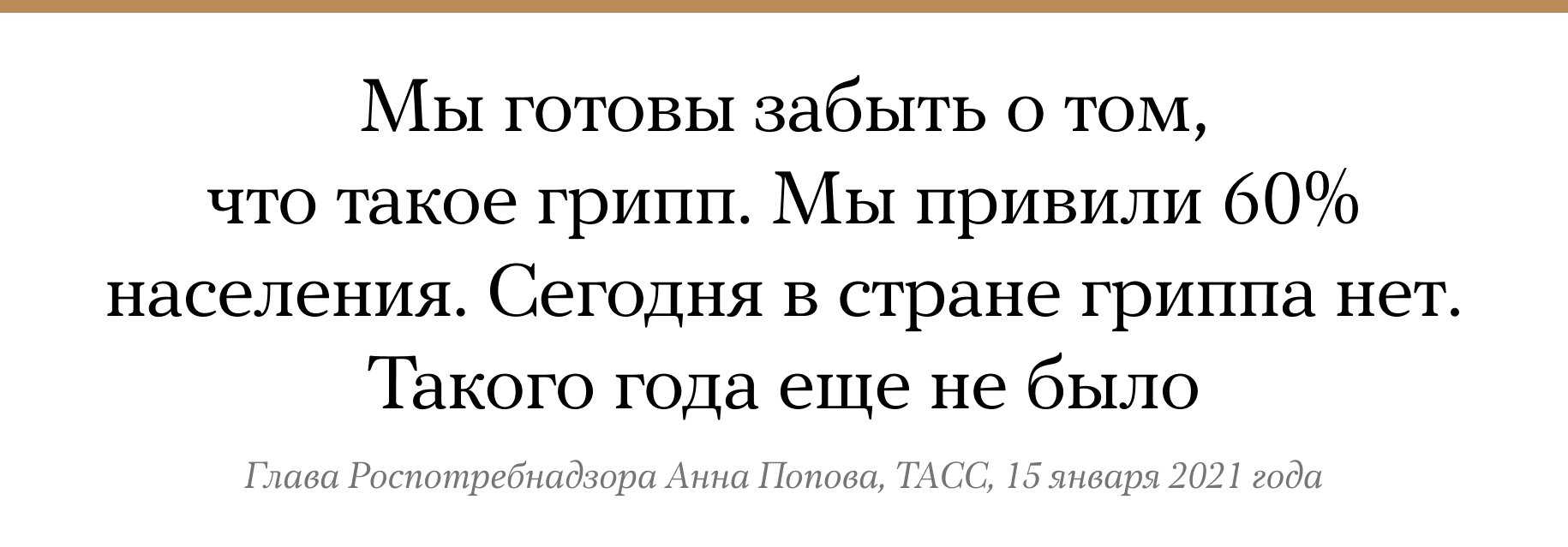 Глава Роспотребнадзора Анна Попова сообщила 15 января, что в этом году в России нет гриппа. Она отметила, что такого года в России еще не было. Попова связала это с тем, что в стране более половины населения получили вакцину от гриппа, а все жители соблюдают правила защиты от респираторных инфекций. Если же вы, несмотря на заверения главы Роспотребнадзора, опасаетесь заболеть, то изучите нашу инструкцию о том, как уберечься от гриппа.