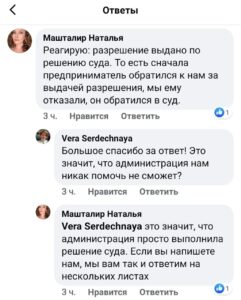 В конце концов, убедившись, что запросы отозваны не будут, департамент ответил на них. Изучив их редакция «Протокола» поняла, что комментарий Натальи Машталир о том, что «пишите запрос и мы на все ответим» — не более чем отговорка, чтобы не давать ответ на крайне неудобный вопрос. Наталья не ответила ни об обжаловании решения, ни о местах размещения рекламных конструкций, ни о том, почему предприниматель с коммерческим спором обратился в районный суд, а департамент архитектуры проигнорировал это.