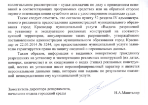 Само решение, которое к тому времени еще не появилось на сайте, Наталья присылать не стала, сославшись на то, что в нем находятся адреса рекламных конструкций, которые являются «персональными данными».