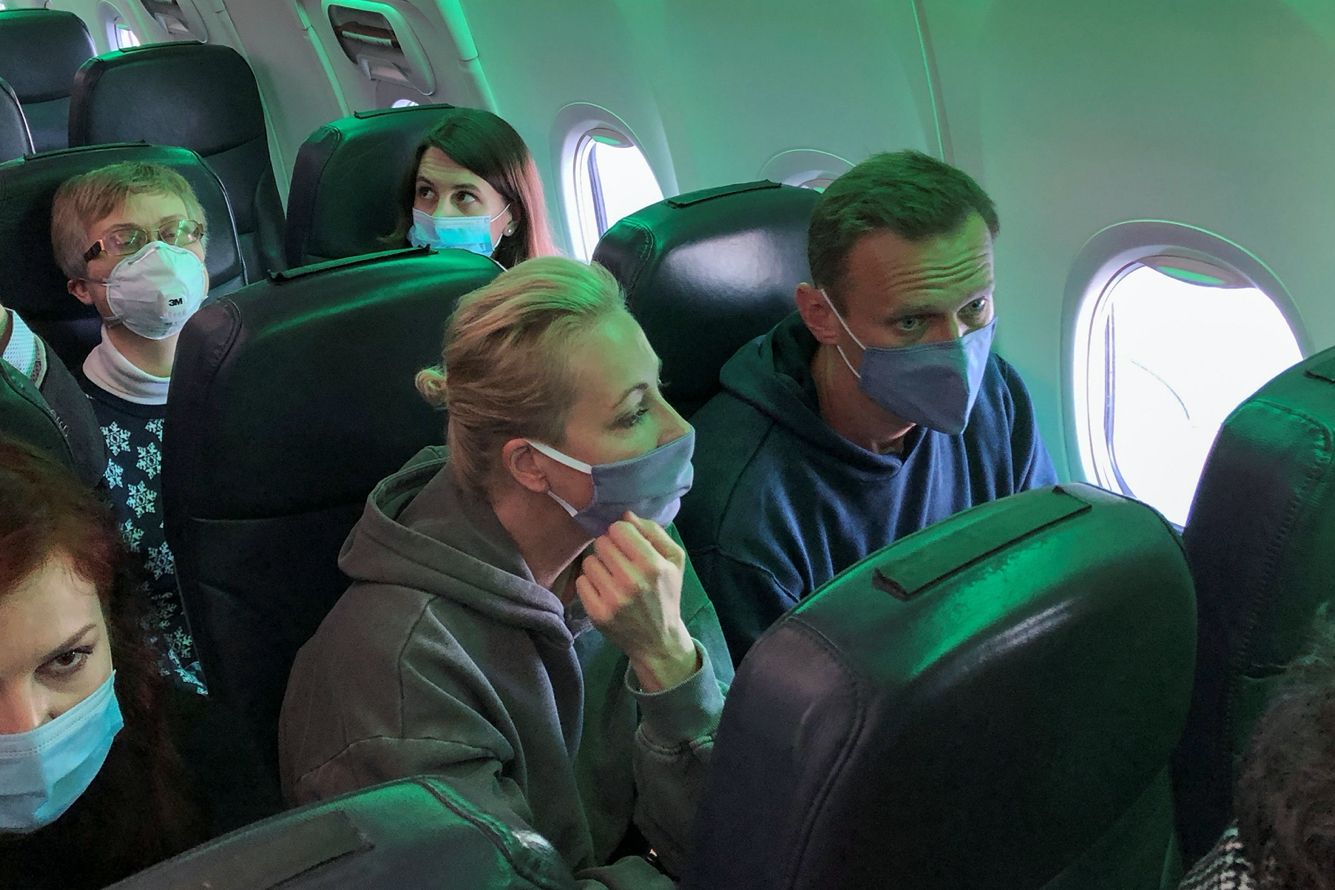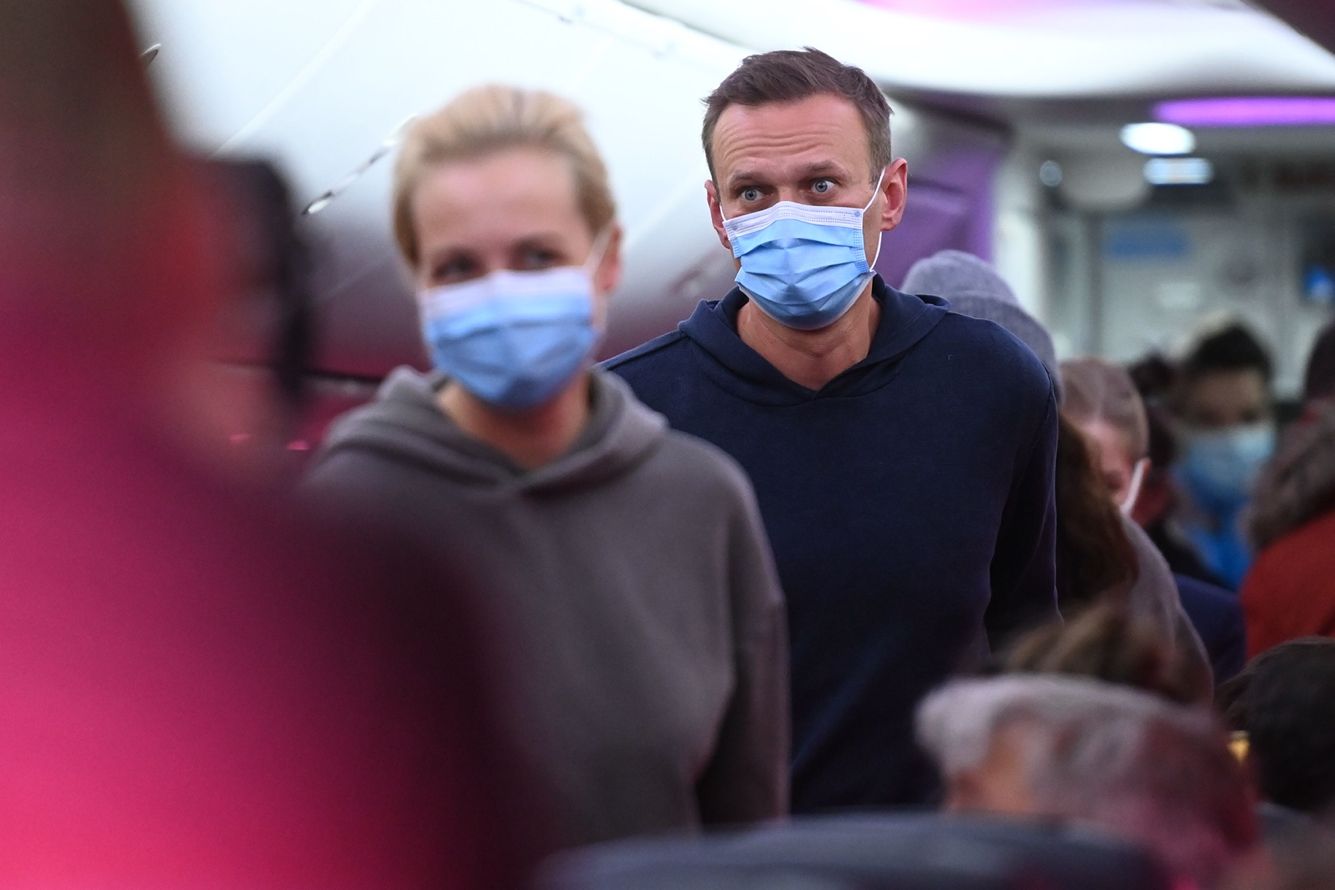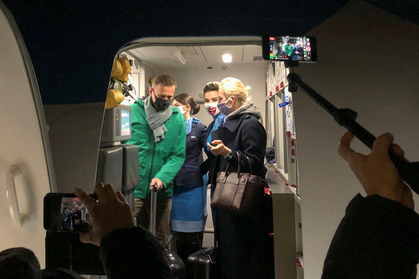 После этого на борт поднялся Навальный, и его обступили журналисты. На вопрос, чувствует ли он себя героем, политик ответил, что чувствует себя «гражданином России, который имеет полное право вернуться домой». Он пообещал новые расследования и сел на свое место в 13-м ряду, назвав его счастливым. Вместе с Навальным летели его жена Юлия, пресс-секретарь Кира Ярмыш и адвокат Ольга Михайлова.