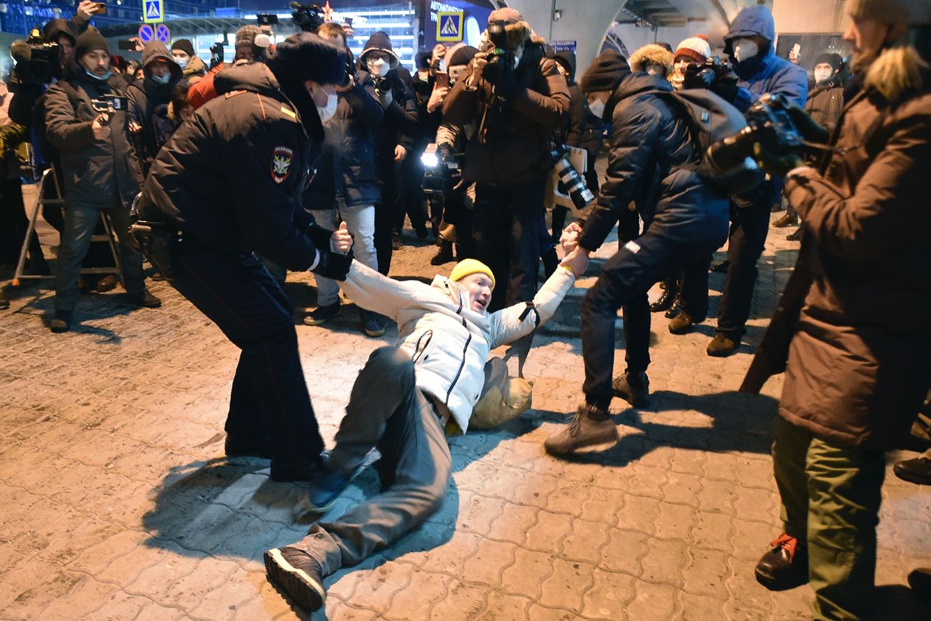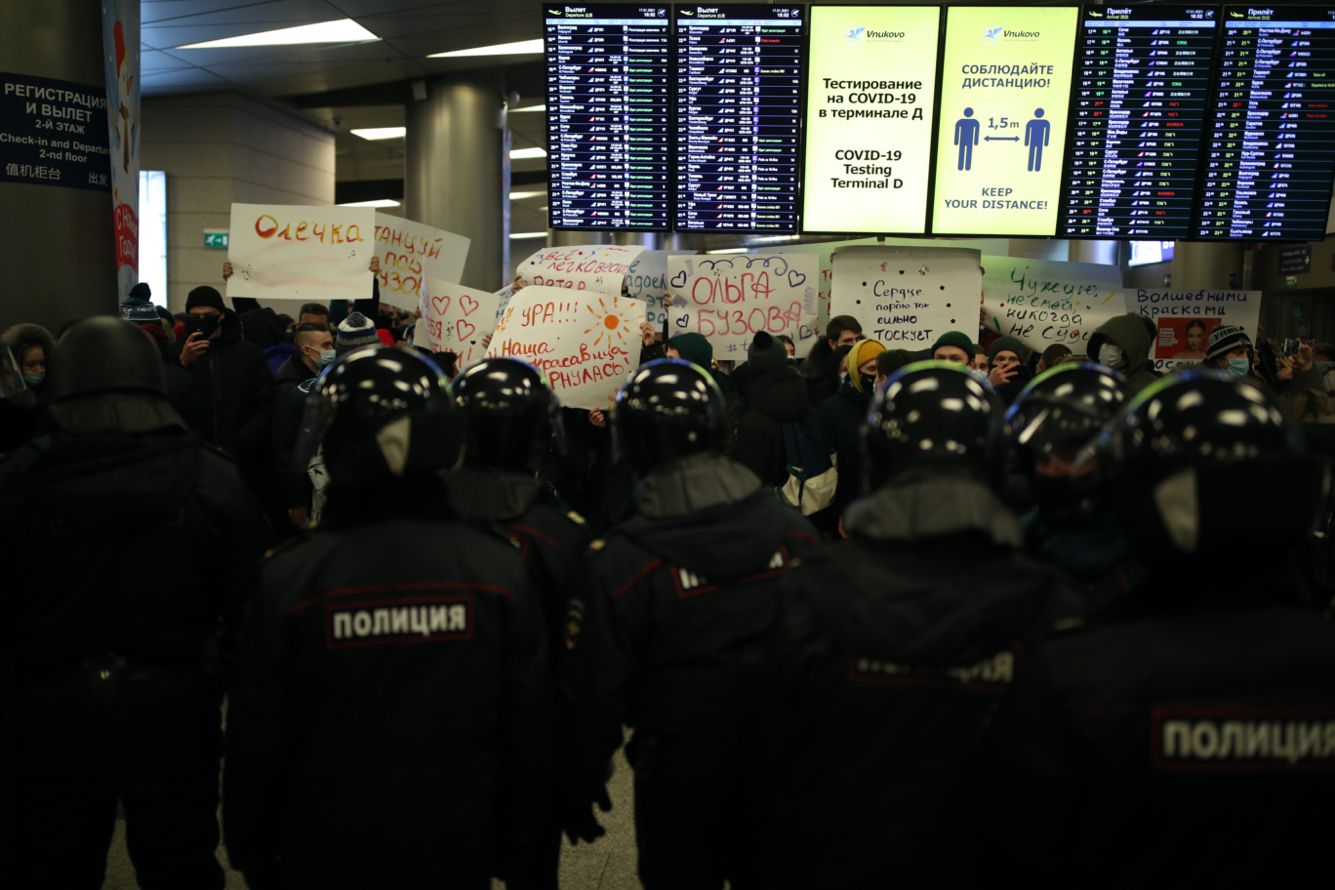 Массовые задержания во Внуково начались еще до прилета Навального. В первую очередь задержали его соратников — Любовь Соболь и Руслана Шаведдинова, брата Алексея Навального Олега, корреспондента «Новой газеты» Влада Докшина и активиста Константина Котова, ранее осужденного по «дадинской» статье. Около семи вечера полиция и ОМОН принялись вытеснять людей из Внуково; к тому моменту только внутри аэропорта находились около 500 человек.