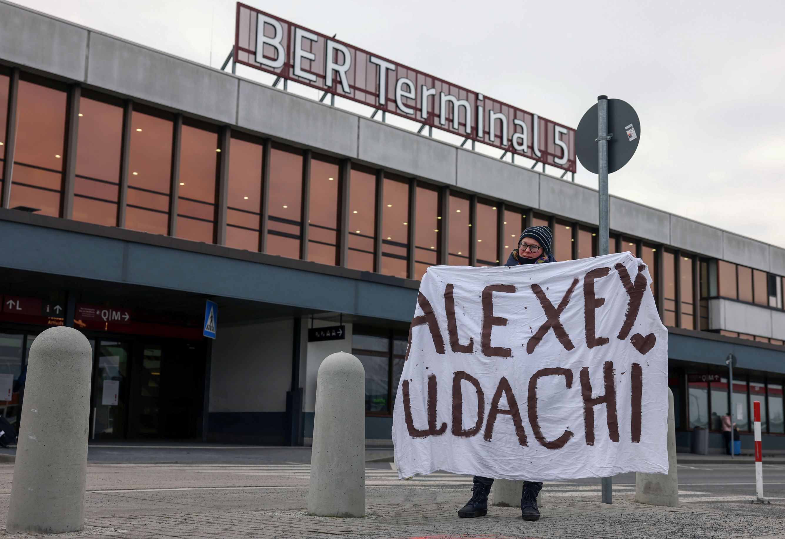 «Alexey Udachi» — такой плакат можно было видеть возле аэропорта Берлин-Бранденбург утром 17 января. Державшая его женщина представилась Катей и рассказала «Медузе», что живет в Германии, лично с Навальным не знакома, но решила поддержать его, потому что «ей не все равно».