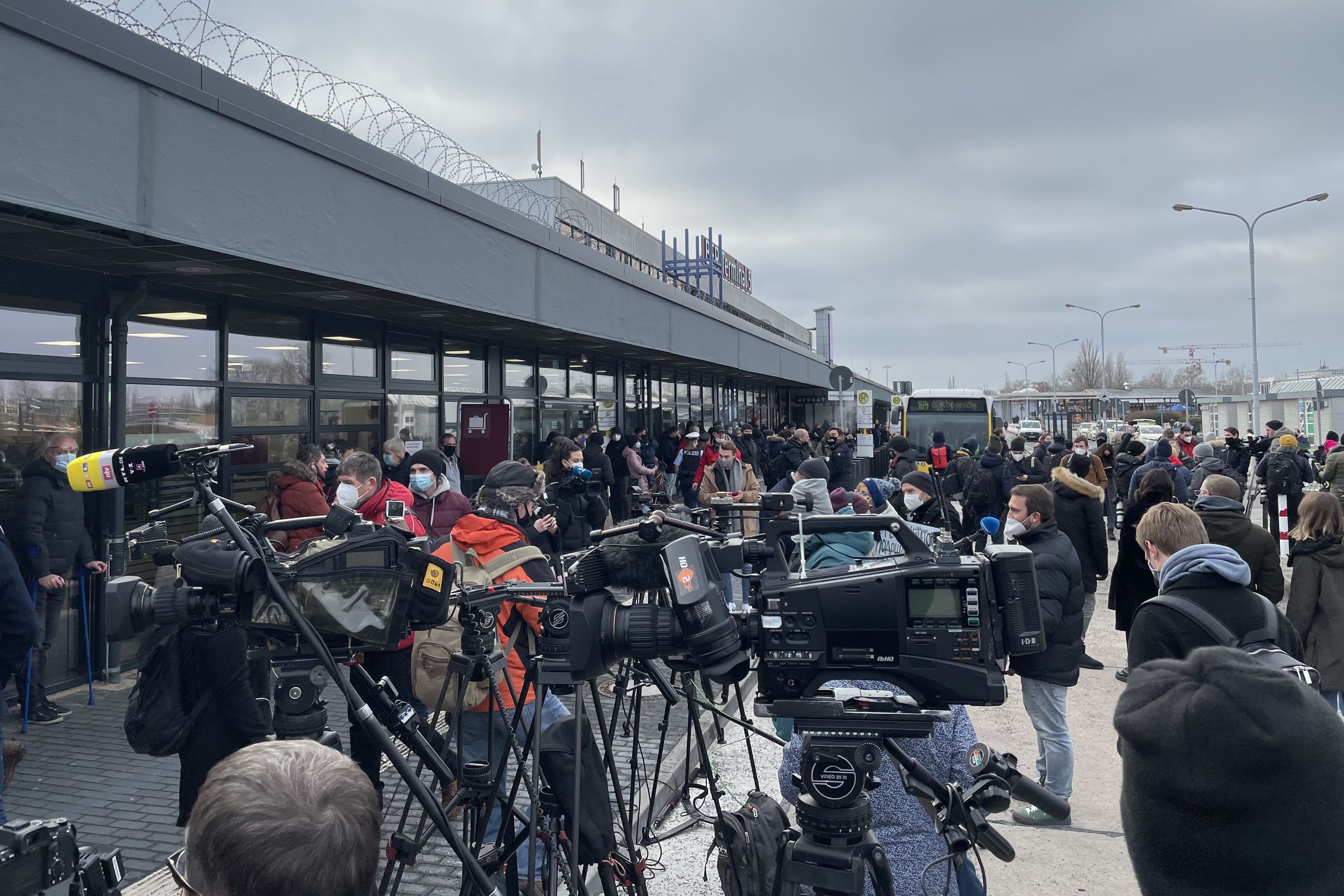 Помимо Кати уже в 11 утра (самолет «Победы» в Москву должен был вылетать в 14:45 по берлинскому времени) Алексея Навального ждали в аэропорту три десятка журналистов и несколько сторонников политика. Двое молодых людей держали плакат «Время диктаторов подошло к концу. Путин боится Навального»; другие давали интервью и позировали перед камерами фотокорреспондентов.