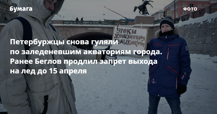 Горожане делятся снимками людей, прогуливающихся по льду у Петропавловской крепости. Под Аничковым мостом провели пикет «Уроки жонглирования булыжниками» — подразумевая, что лед твердый и его якобы не может пробить даже камень. Корреспонденты «Бумаги» заметили днем 17 января велосипедиста, проехавшего по Фонтанке, и девушек, катающихся на коньках по Пряжке.