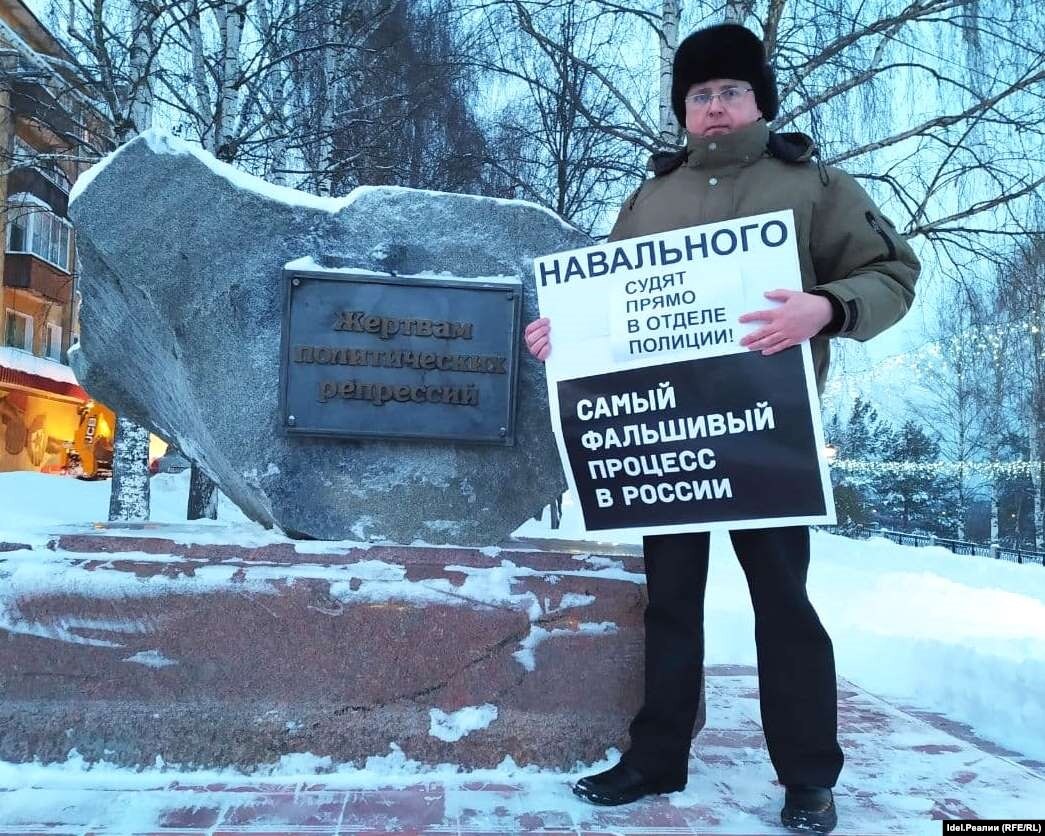 Ананьин вышел к памятнику жертвам политических репрессий на вятской набережной с плакатом "Навального судят прямо в отделении полиции. Это самый фальшивый процесс в мире!".