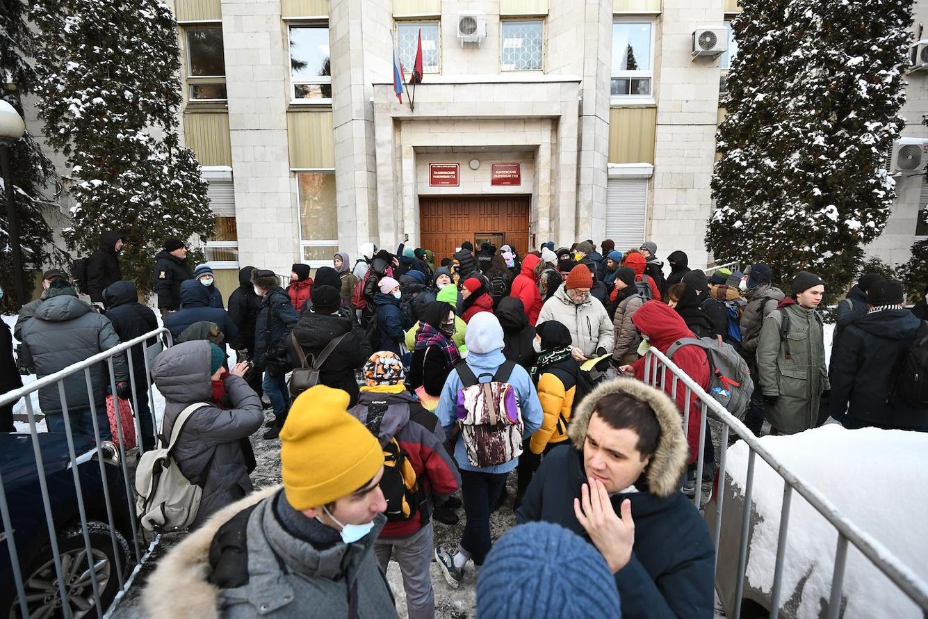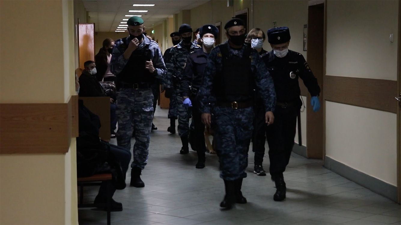 С улицы доносятся крики. Если неделю назад, когда изначально планировалось огласить приговор по «делу о разбитом окне», у Головинского суда собралось несколько сотен человек, то в этот понедельник их порядка 100-150 (не считая представителей СМИ). В здание активистов не пустили, и они остались на холоде — в окружении специально привезенных металлических ограждений и сотрудников полиции. Без задержаний не обходится: в отделение увозят семь человек. Правда, вскоре их отпускают без составления протоколов.
