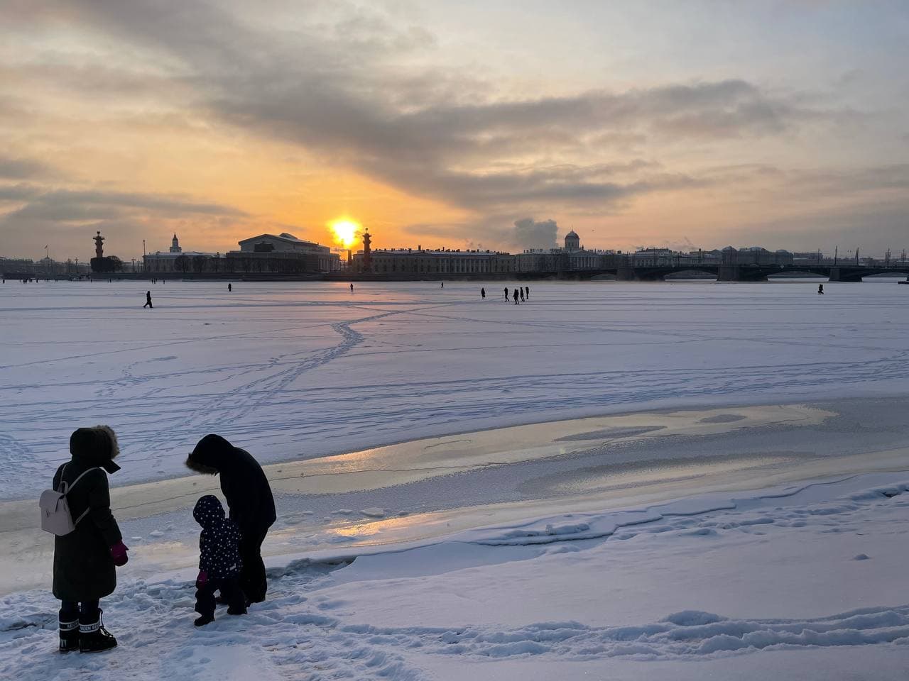 Прямо сейчас на льду у Петропавловской крепости десятки петербуржцев. Они гуляют с собаками, фотографируются и катаются на коньках. На улице — минус 16 градусов.