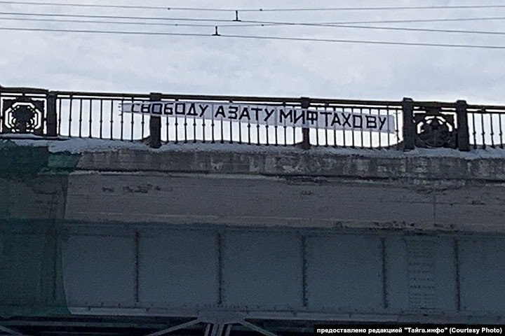 Издание со ссылкой на читателя передало, что, активисты "Российского социалистического движения" вывесили баннер "Свободу Азату Мифтахову" на Октябрьском мосту днем 17 января.