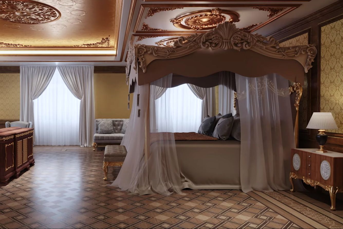 Всего во дворце три этажа. Помимо прочего, там находятся бассейн, сауны, хамамы, «склад грязи», спа, читальня, музыкальная гостиная, кальянная, кинотеатр, дегустационная комната, винный погреб, казино, около полутора десятков гостевых спален. Площадь главной спальни составляет 260 квадратных метров.