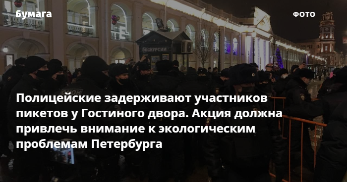 В Петербурге полицейские задерживают участников пикетов, посвященных экологическим проблемам, у Гостиного двора. Об этом сообщили присутствующие на месте событий активисты.