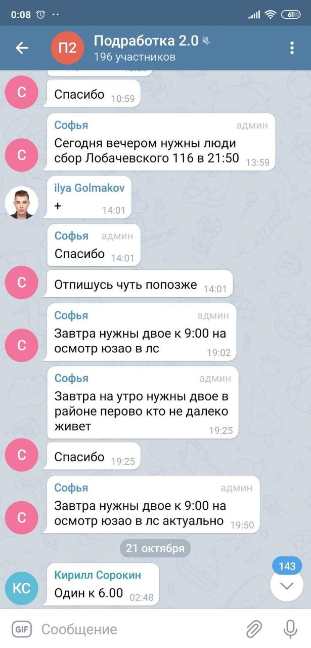 Голунов несколько скриншотов из чата с названием «Подработка 2.0». «Я знаю чат в телеге, где следователи УВД по ЗАО, занимающиеся расследованием экономических преступлений предлагают подработку понятым. Самое частое место сбора — улица Лобачевского, 116 — это здание УВД по ЗАО», — написал журналист.