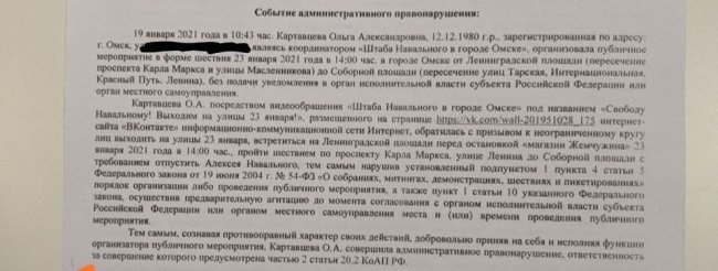 Суд по составленному на Ольгу Картавцеву протоколу планируется провести уже завтра, 21 января.