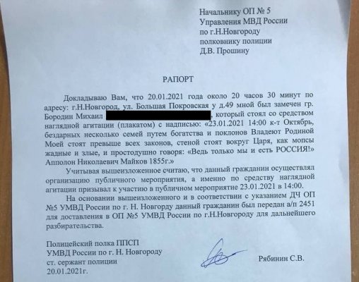 «Данный гражданин осуществлял организацию публичного мероприятия, а именно посредством наглядной агитации призывал к участию в публичном мероприятии 23.01.2021 в 14-00», — пишут полицейские в протоколе.