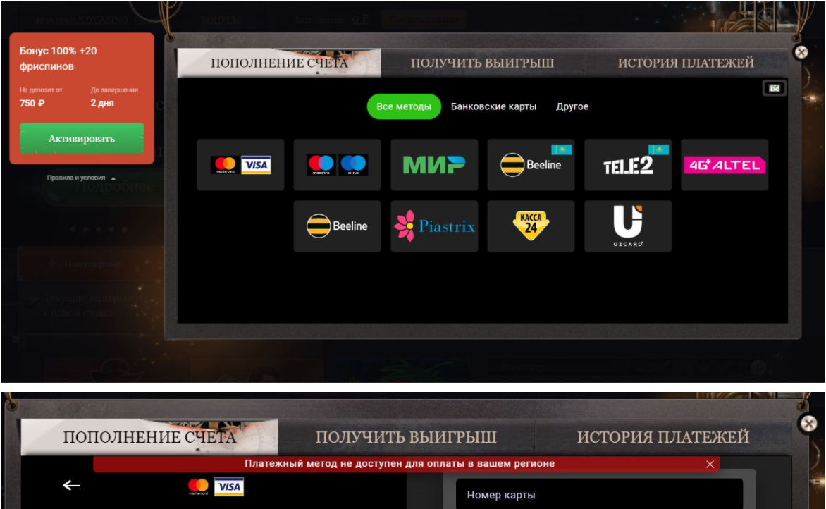 Корреспондент The Bell попытался сделать ставки в крупнейших онлайн-казино, но все они принимают только биткоины. Например, онлайн-казино Admiral777, JoyCasino, Admiral888, Gaminator и другие на первый взгляд работают в обычном режиме и при попытке оплаты показывают форму для ввода данных банковской карты. Но пополнить счет картой или номером сотового там невозможно: система сообщает, что «данный платежный метод недоступен для оплаты в вашем регионе». Корреспондент The Bell безуспешно пытался пополнить свои депозиты для игры через Сбербанк, «Тинькофф», счета в «Мегафоне» и «Билайне», а также сервис «ЮMoney».