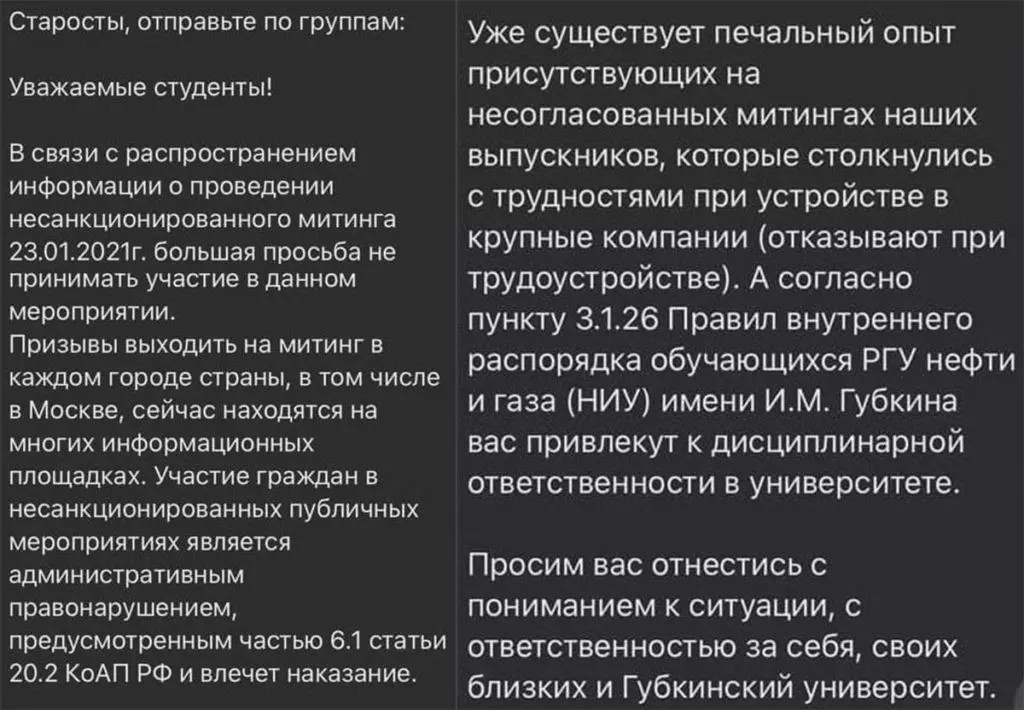 По аналогии с МГУ решили поступить и в Российском государственном университете нефти и газа имени И. М. Губкина. В администрации вуза «убедительно просят» не участвовать в митинге 23 января, аргументируя это статьями административного кодекса. «Уже существует печальный опыт присутствующих на несогласованных митингах наших выпускников, которые столкнулись с трудностями при устройстве в крупные компании», — говорится в сообщении, которое опубликовал телеграм-канал «Бессрочный протест». За участие в несанкционированной акции в университете грозят привлечением к дисциплинарной ответственности за нарушение правил внутреннего распорядка. Несколько студентов, с которыми удалось связаться «МБХ медиа», подтвердили, что получали такое сообщение.