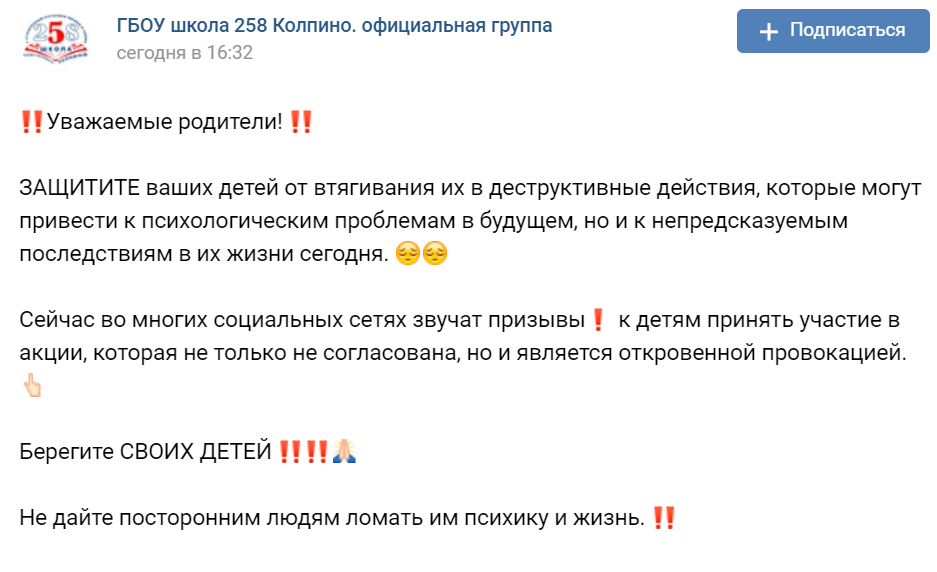 В постах родителей просят «защитить детей от втягивания их в деструктивные действия, которые могут привести к психологическим проблемам в будущем, но и к непредсказуемым последствиям в их жизни сегодня». В них отмечают, что в соцсетях детей призывают принять участие в несогласованной акции, которую называют «откровенной провокацией».