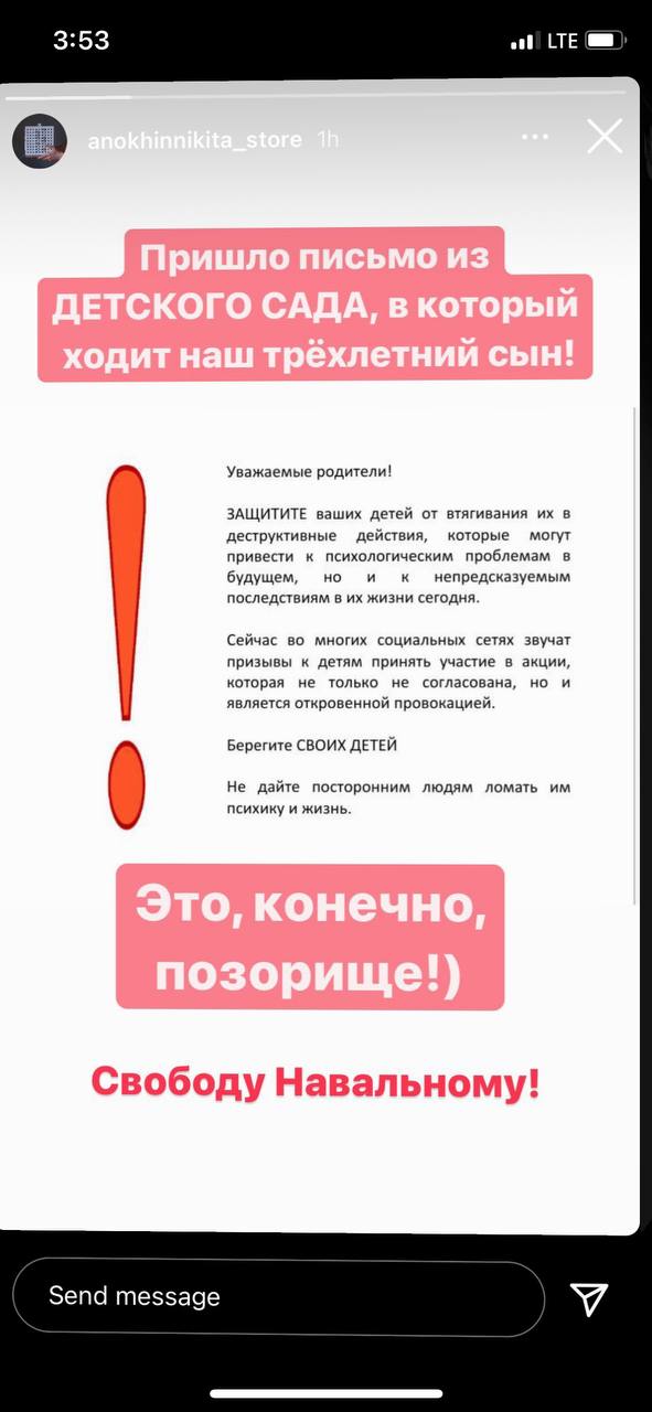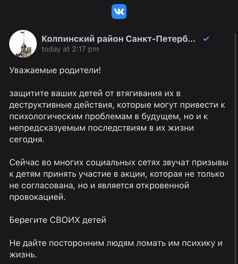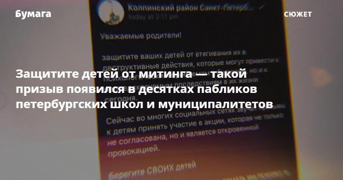 В десятках пабликов школ и муниципальных образований Петербурга 21 января опубликовали одинаковые посты с призывом защитить детей от митинга. Такие же сообщения присылают в родительские чаты — даже в детсадовские. В соцсетях показали план классного часа про вред несанкционированных акций, который якобы разослали по школам города. В некоторых вузах тоже ведут профилактические беседы.