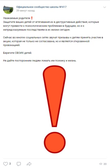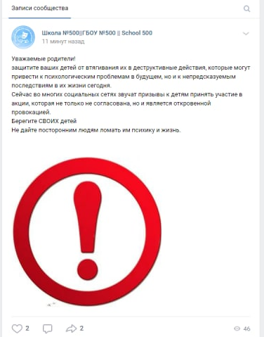 На сайте гимназии №190 родителей просят "защитить детей от втягивания их в деструктивные действия". Аналогичные сообщения распространяют среди пабликов школ во "ВКонтакте". Просьба не пускать детей на митинги были опубликована в группе школы №123, но сейчас сообщение удалено.