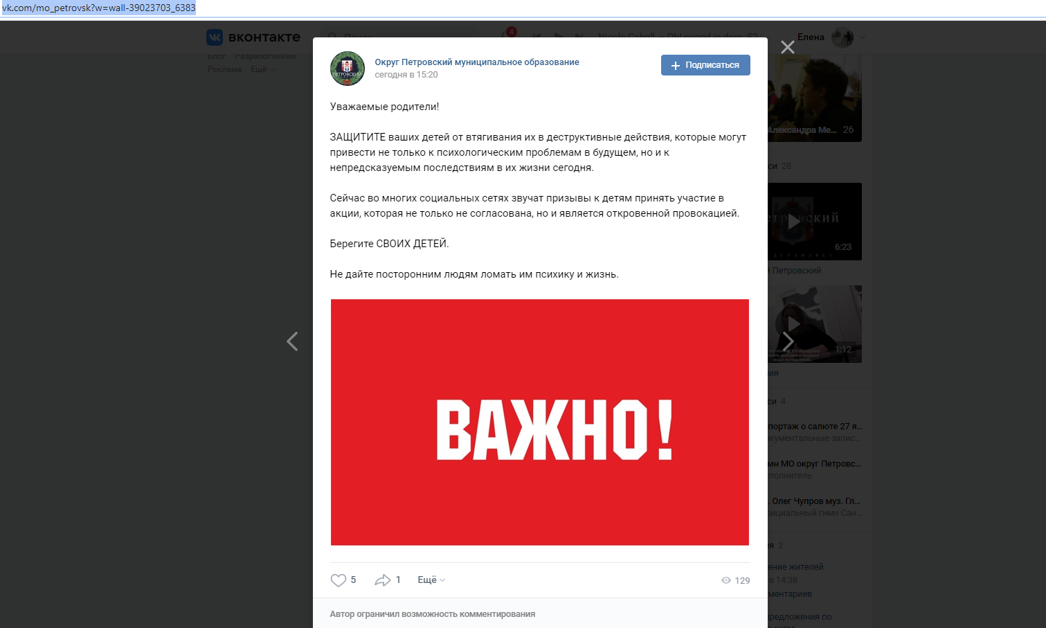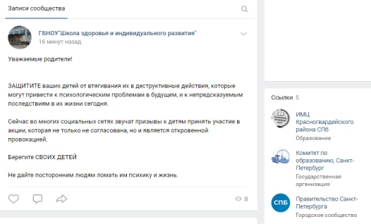 Кроме образовательных учреждений сообщения публикуют в пабликах районных и муниципальных администраций. Например, подобный пост с призывом не пускать детей на несогласованное мероприятие опубликовали в группе муниципального округа "Петровский".