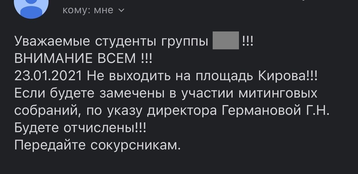 В карельском колледже технологии и предпринимательства среди студентов рассылают сообщения с требованием не ходить 23 января на акцию в Петрозаводске. Учащихся, которые будут замечены в протестах, пообещали отчислять.