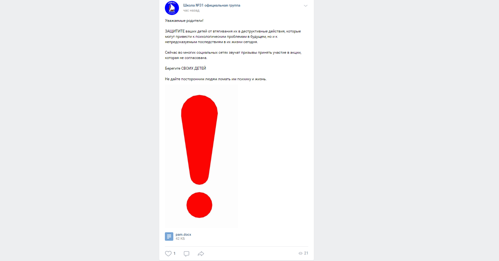 Школа №31 опубликовала во "Вконтакте" запись вместе с документом-памяткой. На данный момент запись в группе школы удалена. Аналогичную памятку в своей группе во "ВКонтакте опубликовала школа №96.