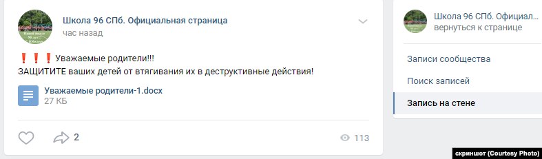 Записи с призывом не ходить на митинги в группах петербургских школ удалили через несколько часов после публикации.