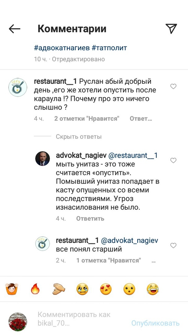 "Эти люди не понимая или умышленно пишут: не было же изнасилования, значит не было факта ОПУСКАНИЯ, даже, мол, адвокаты это отрицают, значит, Рамиль виновен. Я много лет проработал в органах милиции и могу дать пояснение этому моменту. Меня поймут люди, хоть каким-то образом имеющие или имевшие отношение к криминальному миру. Люди, работавшие в милиции и работающие сейчас в полиции, люди служащие во ФСИН. Люди, которые служили и служат в армии, где имеют место быть неуставные отношения.