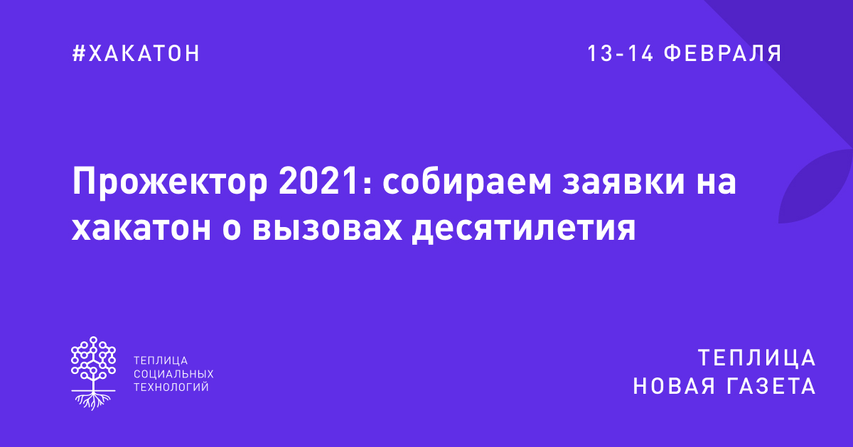 13–14 февраля 2021 года команды «Теплицы социальных технологий» и «Новой газеты» проведут хакатон «Прожектор2021» об актуальных вызовах десятилетия. Участники создадут приложения, сервисы, проведут исследования и расследования на основе данных и задач, предложенных некоммерческими организациями.