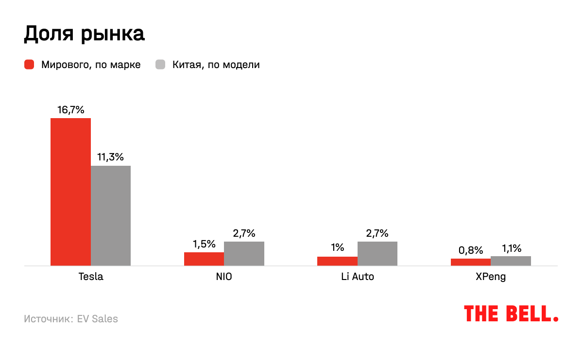 В Китае, как и в мире в целом, лидирует Tesla. Сейчас компании принадлежит 17% мирового рынка, а одной ее модели Tesla Model 3 — 11% китайского рынка.
