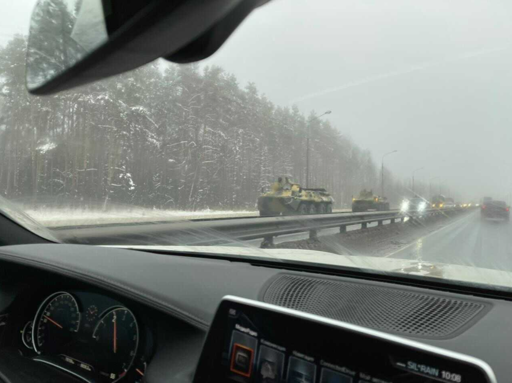 Корреспондент «Медузы» заметил на подходах к Москве бронетехнику. Колонна двигалась около 10:00 по Горьковскому шоссе в сторону столицы.